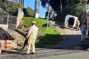 Mulher tomba carro em subida no Ahú e bombeiros fazem resgate delicado