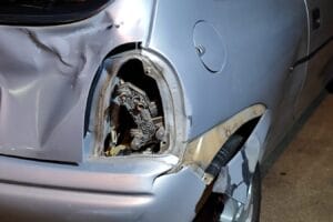 Motorista erra rua, volta em marcha ré, bate contra moto e duas pessoas ficam feridas em acidente
