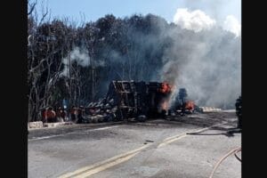 Motorista morre carbonizado após caminhão com carga de botijões de gás pegar fogo na BR-277