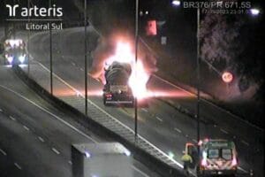 Um caminhão-tanque pegou fogo e provocou a interdição da BR-376, em Guaratuba, no litoral do Paraná, no fim da noite…