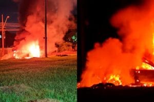 Carro pega fogo após suposta confusão em acidente que deixou motociclista gravemente ferido na RMC