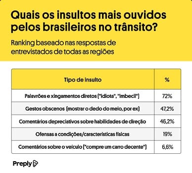 No momento da raiva, ao que indicam essas pessoas, as ofensas mais comuns parecem girar em torno de palavrões e xingamentos diretos, gestos agressivos e comentários depreciativos sobre suas habilidades de direção, crítica mais recebida pelas mulheres (47%) que por condutores homens (45%).