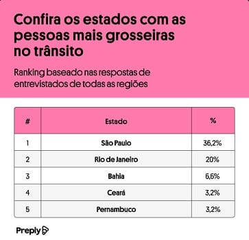 Atestando que sim, existem diferenças regionais para o comportamento no trânsito, segundo os entrevistados. Seriam três os estados com o maior número de pessoas agressivas no trânsito: São Paulo (36,2%), Rio de Janeiro (20%) e Bahia (6,6%). Eles lideram o pódio dos comportamentos mais indelicados ao lado dos habitantes do Ceará (3,2%) e Pernambuco (3,2%).