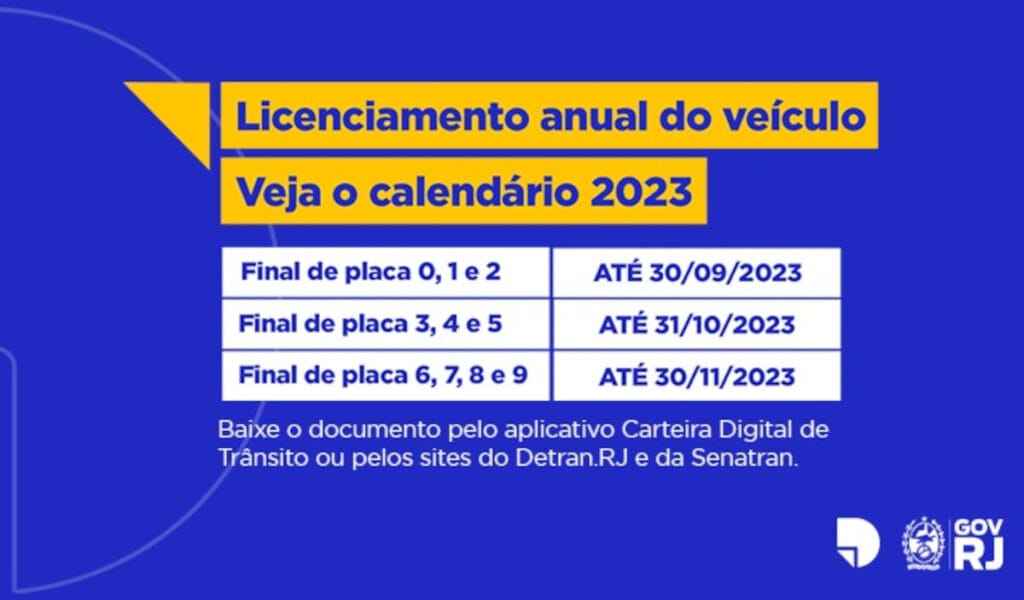 O Detran/RJ prorrogou os prazos para o licenciamento anual de veículos em 2023. O novo calendário foi publicado no Diário Oficial do Estado. Para os veículos com final de placa 0, 1 e 2, o prazo de licenciamento, que antes terminava no dia 31/5, vai agora até 30 de setembro de 2023. Para os veículos com final de placa 3, 4 e 5, o pagamento pode ser feito até 31 de outubro de 2023. E para os veículos com final de placa 6, 7, 8 e 9, o prazo final passa a ser 30 de novembro de 2023.