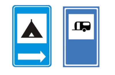 Se você for “motorista de primeira viagem”, talvez ainda não tenha visto essas sinalizações. A primeira, à esquerda, com um desenho de uma barraca, indica de área de campismo. Já a segunda, à direita, sinaliza uma área para estacionamento de trailers.