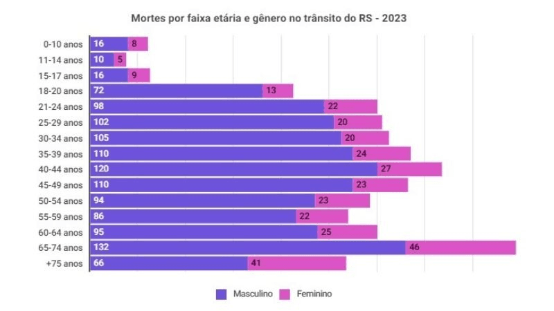 A tendência que não muda é a de que a quantidade de homens que morrem é quatro vezes superior à de mulheres. A proporção se mantém mais ou menos estável desde o início da série histórica do DetranRS com a utilização da mesma metodologia, em 2007.