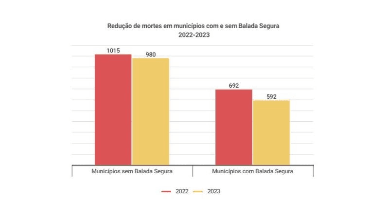 A análise da acidentalidade com morte trouxe indícios do resultado positivo da Balada Segura para a redução dos óbitos. Se comparada a variação das mortes nos municípios que desenvolvem o programa com os que não fizeram o convênio, a redução da mortalidade foi bem maior para os primeiros. Nas 40 cidades com Balada Segura, a redução foi de 14,5% em relação a 2022, enquanto nas demais a queda foi de 3,4%.