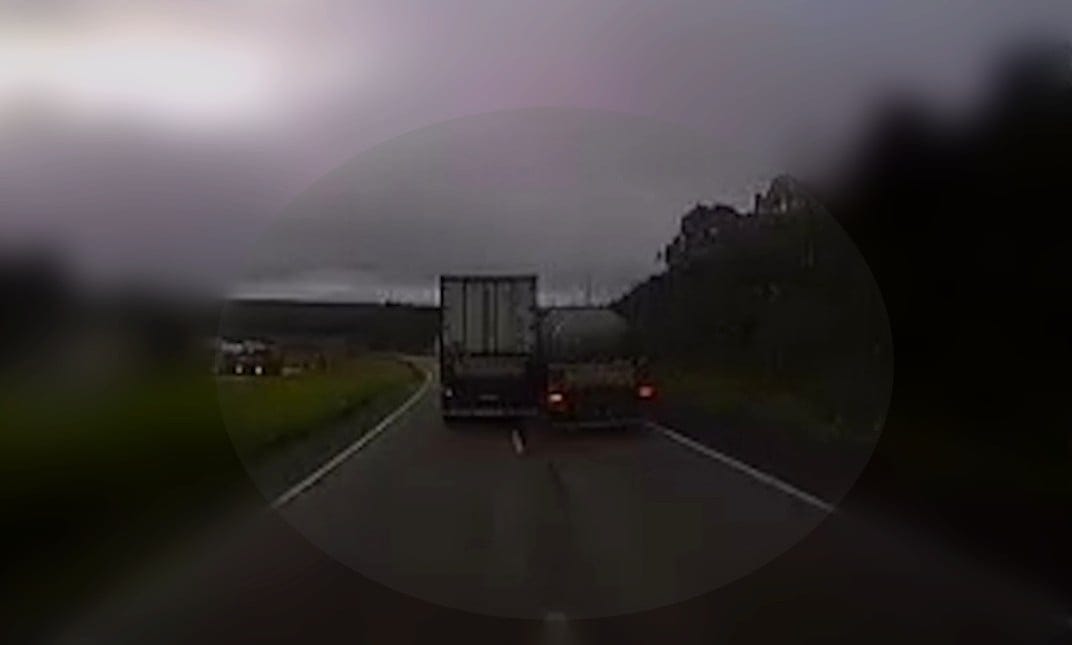 Nas imagens, é possível ver quando uma carreta, que transitava na faixa da esquerda, invade a faixa da direita e atinge a lateral do caminhão-tanque, que tomba segundos depois.