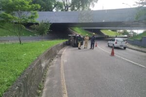 Três PMs e casal ficam feridos após batida entre viatura e carro em Curitiba; veículos tombaram